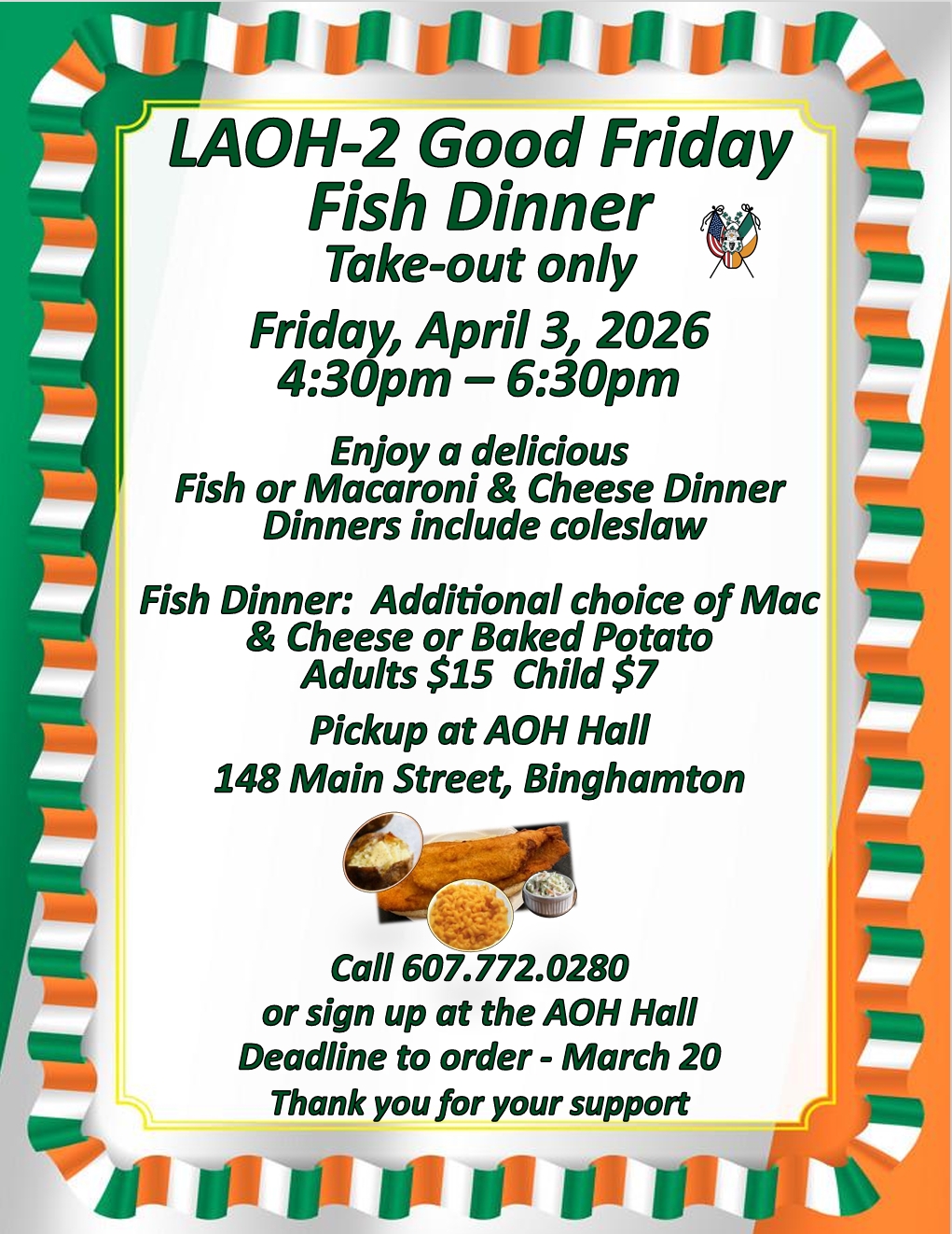 Come to Binghamton and join us for the 2026 Annual St. Patrick's Day Parade!!! Then come down to the hall for live music, food and some lib...